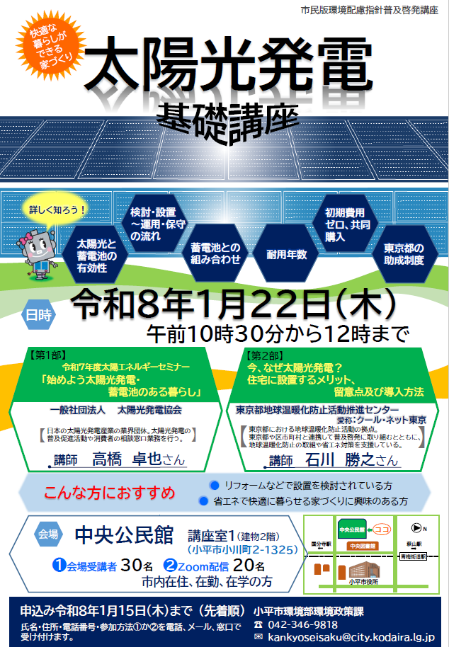 災害時の生命線となる電力の確保や脱炭素社会の実現に貢献する太陽光発電のある暮らしについて、一般社団法人太陽光発電協会から学びます。また、導入のメリットや留意点について東京都地球温暖化防止活動推進センター(クール・ネット東京)が説明します。