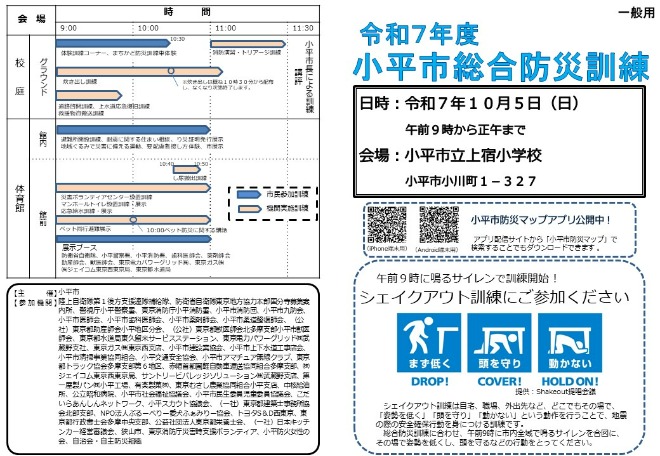 なお、総合防災訓練に合わせて、訓練当日の8時30分頃から訓練終了までの間、小平市ホームページ・携帯電話用ホームページを緊急災害ホームページに切り替えます。また、メールマガジン及びSNS(X、Facebook)により訓練の記事を複数回投稿します。