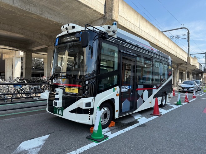 小松市では、小松空港と北陸新幹線小松駅間4・4キロメートルの自動運転バスの実証実験を行っており、すでにお客様をのせた路線バスとして1日11便を運行しています。