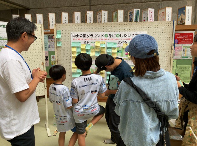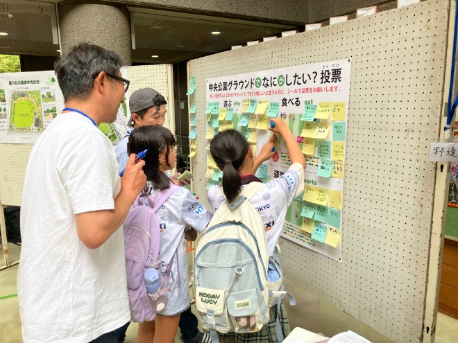 投票では、新しく整備する人工芝のグラウンドで、できたら嬉しいジャンルにシールを貼ってもらいました。また、選んだジャンルで具体的にやりたいことがある方には、その内容を付箋に書いてもらいました。今回は200人以上の方々にご参加いただいており、主だった意見としては【遊ぶ:おにごっこ、すべり台、こどもと一緒に遊べる環境等】、【食べる:お弁当、アイスクリーム、キッチンカー等】、【休む:ゴロゴロしたい、日陰(木陰)が大事、ハンモック等】、【運動する:サッカー、キャッチボール、バドミントン、ドッチボール、スラックライン等】といったものがありました。