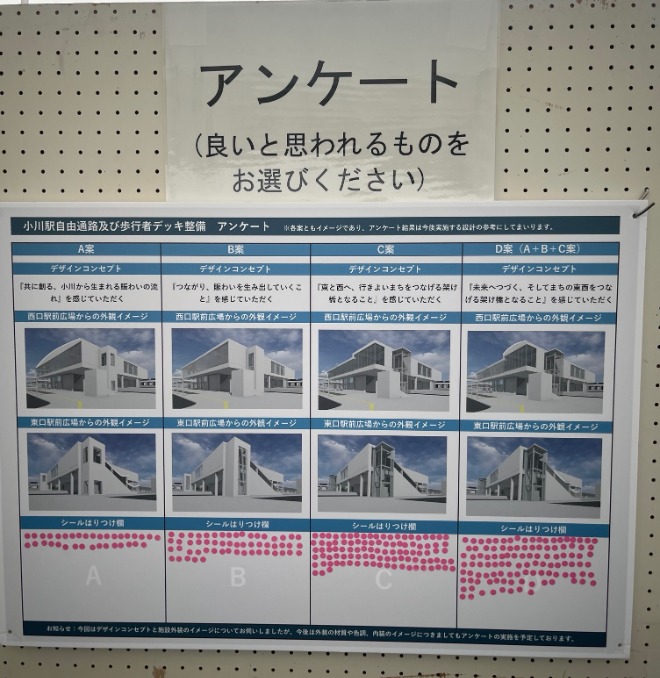 西武鉄道国分寺線小川駅の駅舎建替えに伴う東西自由通路及び小川駅西口地区の再開発ビルと駅舎をつなぐ歩行者デッキの整備に関するオープンハウス(注)を開催しました。また、東西自由通路及び歩行者デッキのデザイン(形状のイメージ)についてのアンケートを行いました。