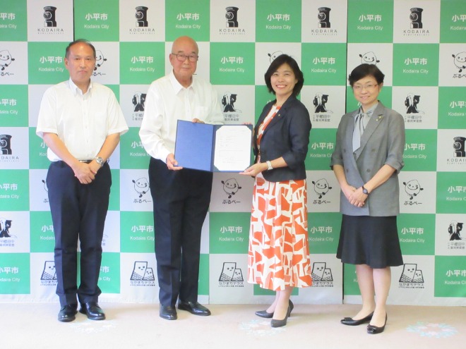 左から小平市シルバー人材センター余語事務局長、小平市シルバー人材センター山﨑会長、市長、教育長