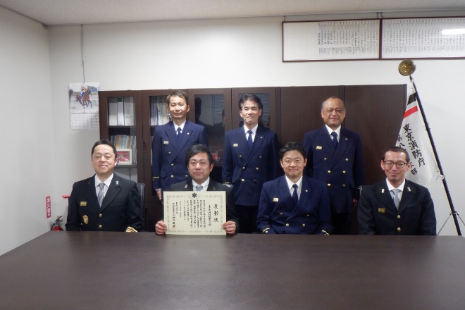 この効果的な消火活動により、被害を最小限に収めることができた小平市消防団第九分団の功績に対して、東京消防庁第八消防方面本部長から表彰状が授与されました。